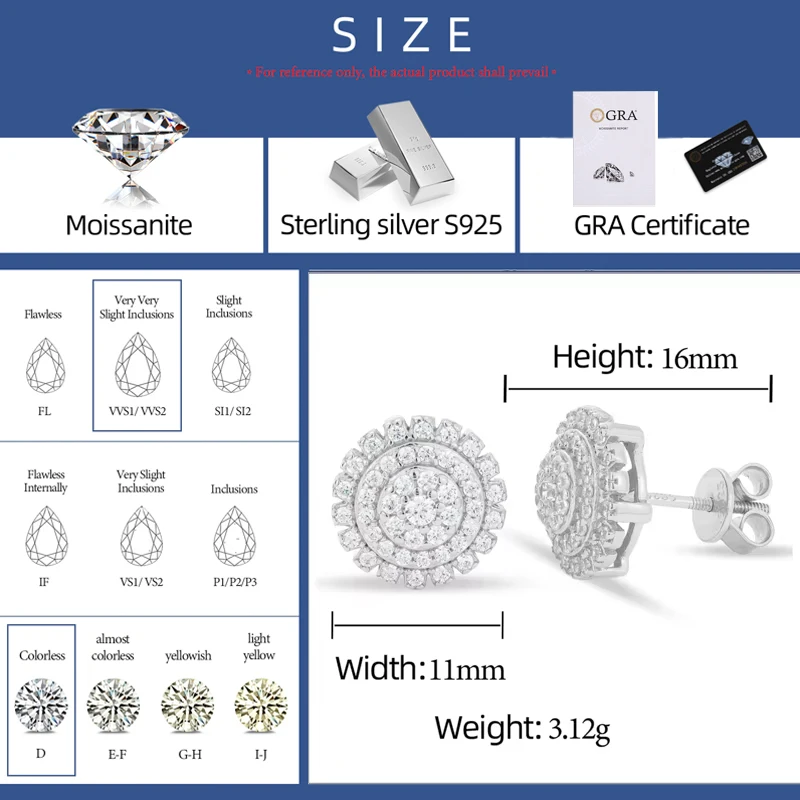 New Trendy 925 Sterling Silver Sunflower Stud Earrings for Women Men Full Moissanite